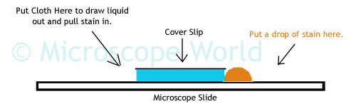 The image above shows how to draw a stain into a prepared slide. With the cover slip in place on top of the specimen, place a drop of stain on the edge of the cover slip. On the opposide side of the cover slip place a paper towel or cloth to draw the liquid out from the cover slip. As the liquid is drawn out, the stain will be pulled in under the cover slip.