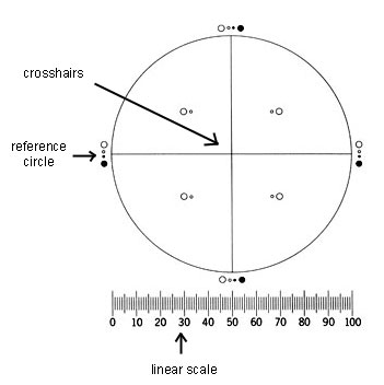 The particle counting reticle is divided into four quadrants by crosshairs - each showing transparent and black reference circles 10um and 25um in diameter at 100x magnification. The reticle also must contain a linear scale graduated in 10um increments (see below image).