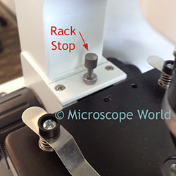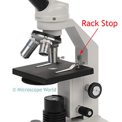 Rack Stop (or Safety Rack Stop): Usually set at the factory, the rack stop keeps you from cranking the objective lenses too far down and damaging either the objective lens or the microscope slide. If you are using a very thin slide, you may find that you can't get the high power objective lens close enough to the slide to focus. Here you can either adjust the rack stop or place a thin glass slide under your original slide, making it closer to the lens. Microscope rack stops are commonly found on high school student microscopes in order to keep students from damaging objective lenses.