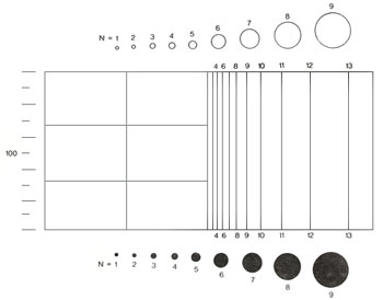 The half of the Porton reticle with vertical lines serves to define the counting area of the field. Twenty fields located at random on the sample are counted and total asbestos fibers longer than 5mm are recorded. Any particle having an aspect ratio of three or greater is considered a fiber. The fiber lengths are determined by comparison with the cirles on the reticle. The square that is divided into six rectangles is the counting field area.